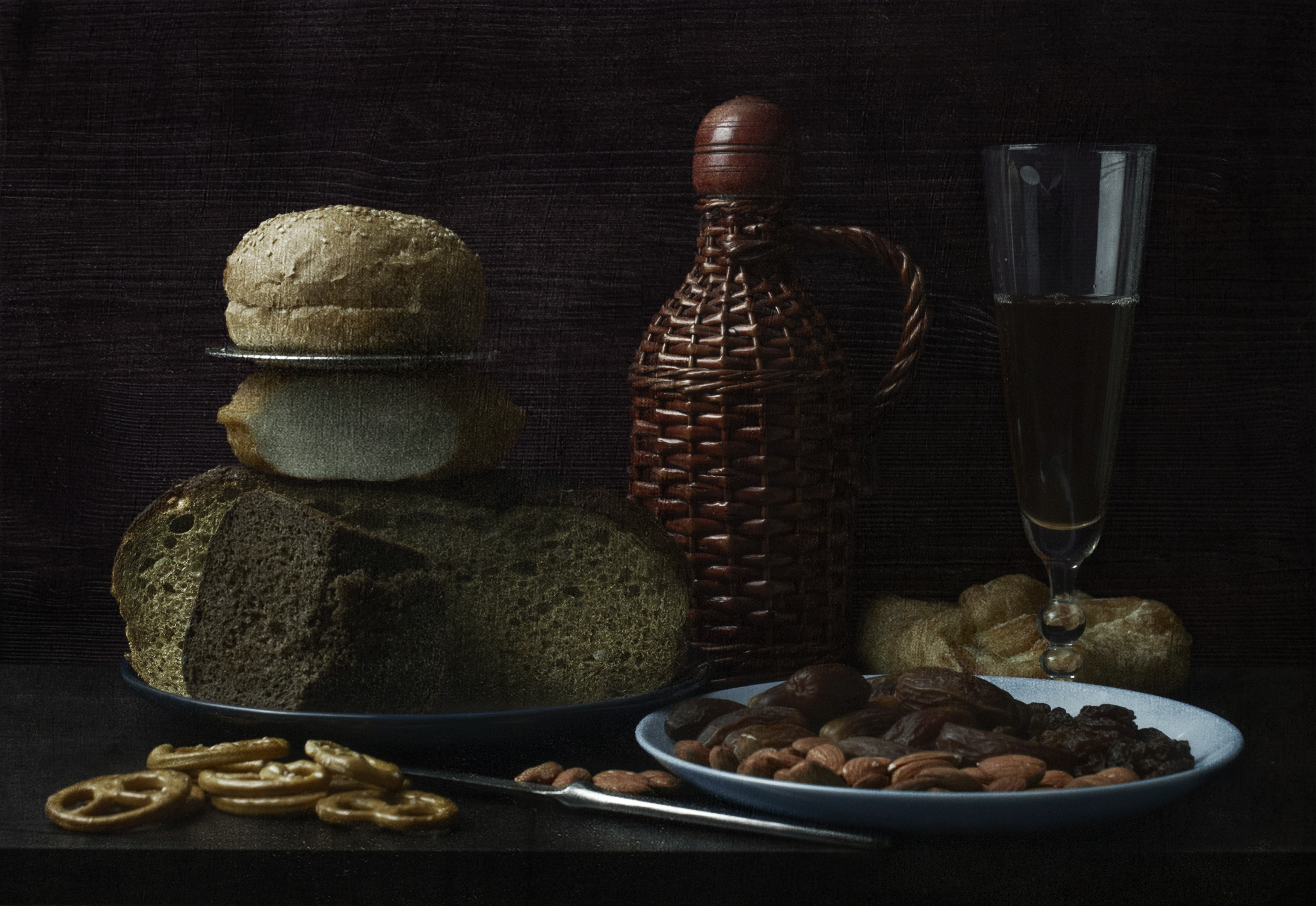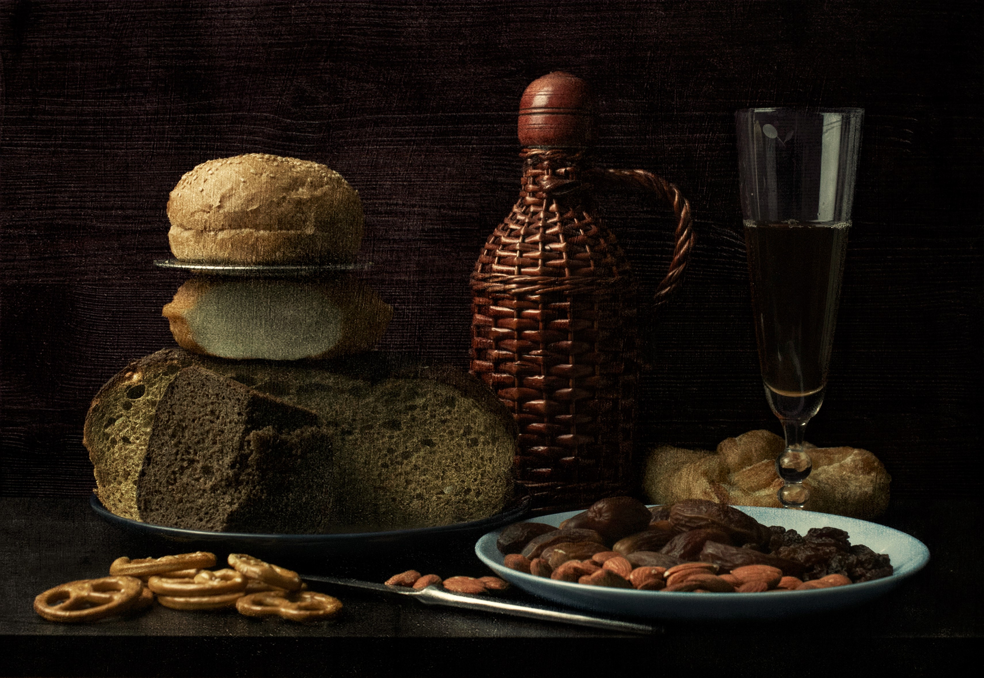 но знаете чего лично мне не хватает - тёплого цвета/света. На фото свежий хлеб, крендельки, орешки и какой-то светлый, явно золотистый, напиток в бокале, но смотрится всё очень мрачно и серо