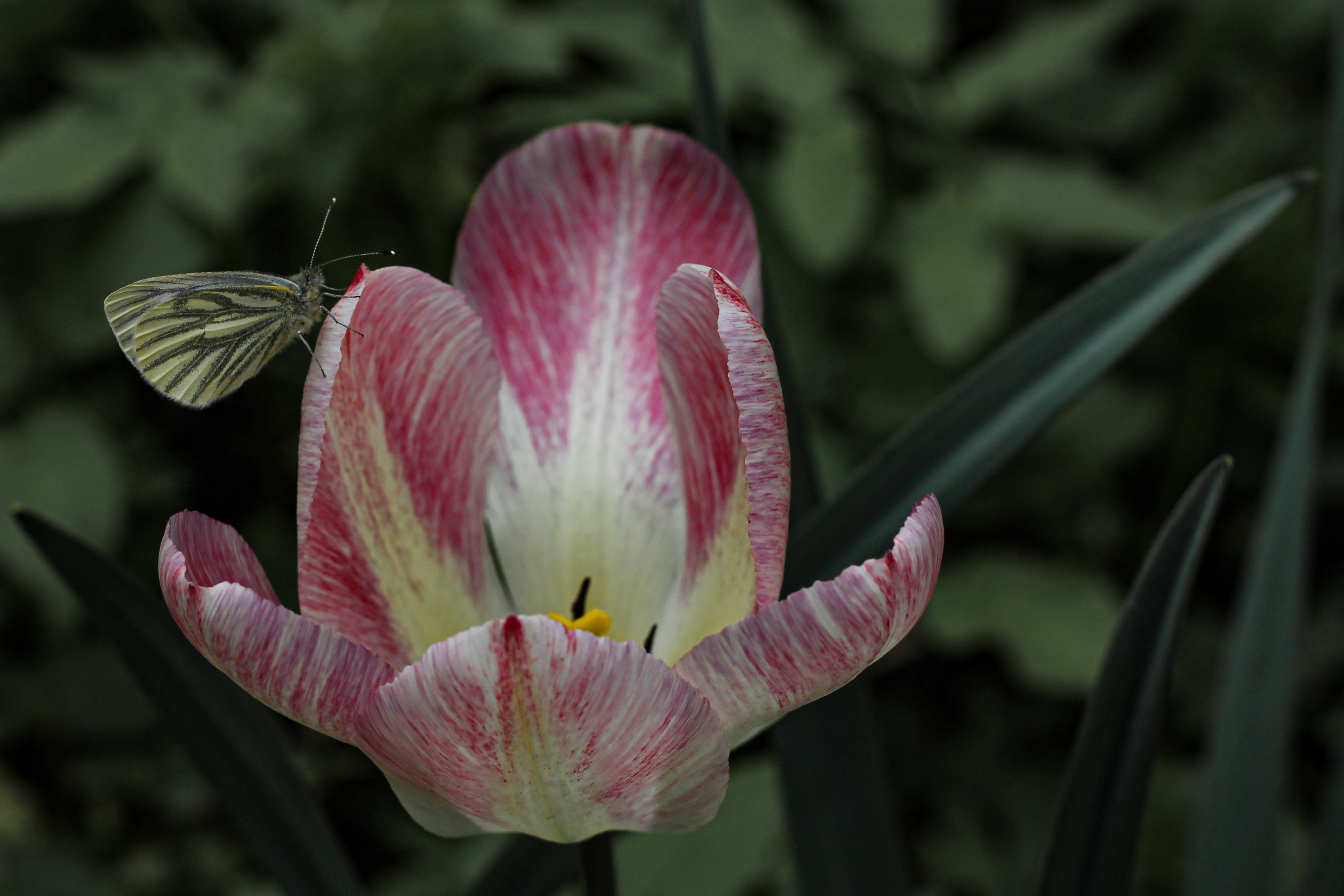 Это мне женщина показала бабочку на тюльпане. Она сама рядом снимала на телефон. А бабочка прямо приросла к лепестку - долго никуда не улетала.