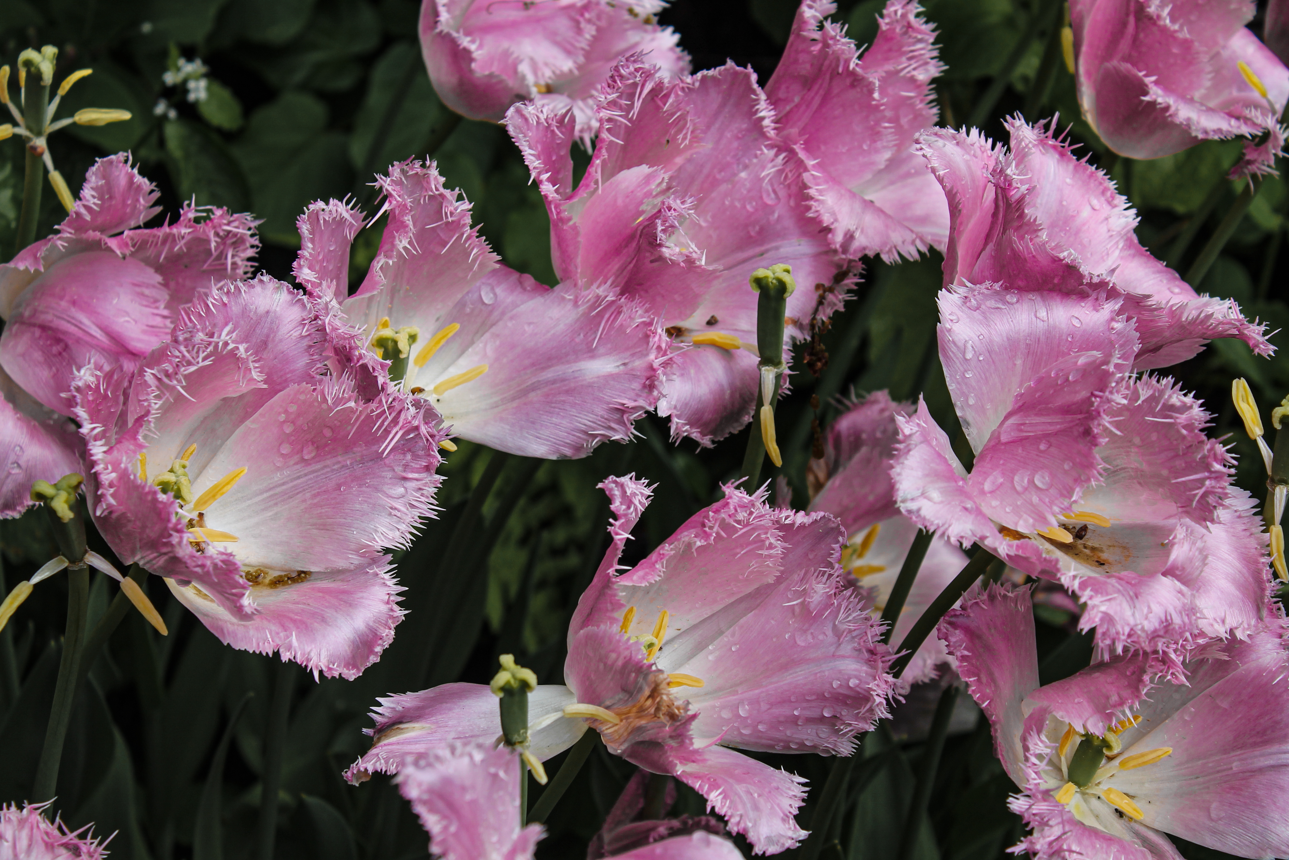 Облетающие тюльпаны после дождя в Тверском ботаническом саду.